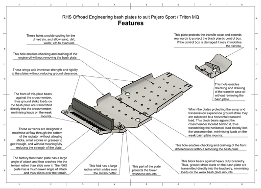 Strength Features - Design features can make or break a bash plate. Every bash plate made by RHS Offroad Engineering has a long list of 'strength features' by design. In some cases this can mean it is much more costly for us to manufacture a bash plate, but this is the kind of dedication we apply in order to supply the best bash plates on the market and best meet your needs. For example, RHS bash plates transmit loads directly into the crossmembers where possible in order to reduce stress on any vulnerable mounts. The bash plates also strengthen and protect crossmembers, linking them together and preventing objects from entering their space and applying large horizontal loads. Our experience as 4WD operators and engineers enables us to simulate likely forces, load paths and failure modes in order to design for extra resilience.