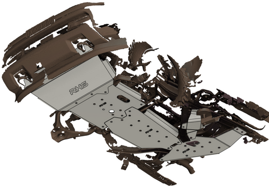 Protection and Coverage - The heirarchy of protection offered by RHS bash plates is first and foremost directed towards vulnerable items that keep you going, such as intercoolers, radiators, fuel coolers, fuel lines, brake lines, electrical wiring, solenoids, filters, oil pans, fluid transmission lines, transmission housings, exhaust sensors, etc. Second tier items are the other aspects of the vehicle such as the body and chassis including crossmembers and lower wishbone mounts. The third tier are the bash plates themselves, we want them to be designed to not be damaged, but in extreme cases we would rather these be damaged than the vehicle or its vulnerabilities. The fourth tier are the bolts that hold the bash plates on, a single bolt typically costs at most a few dollars and they are generally easily replaced.