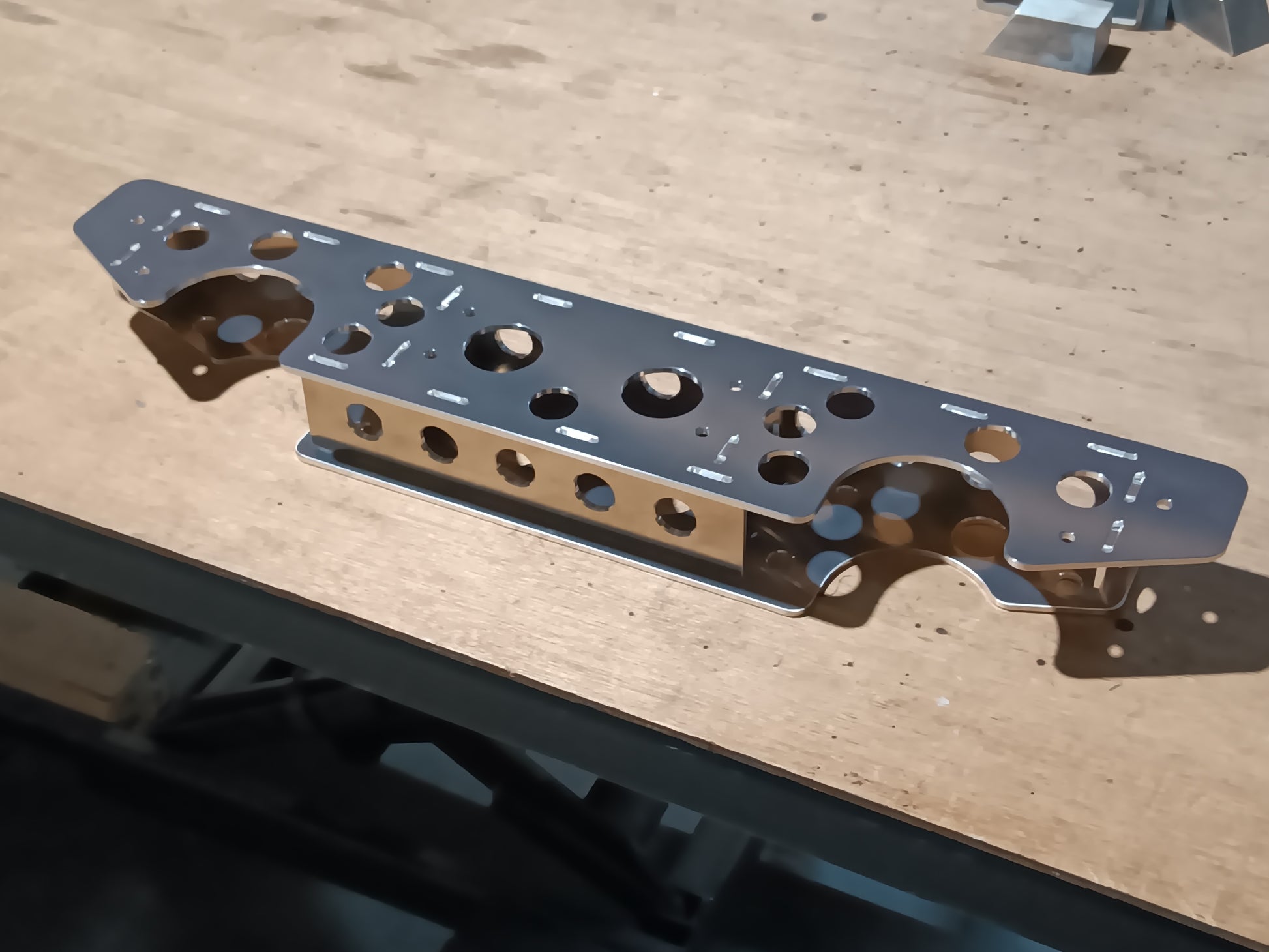 6.1mm thick 6061 T651 aircraft grade 242MPa -- machined easy care finish, similar strength to 6mm mild steel (250MPa), as light as 2.1mm steel.
